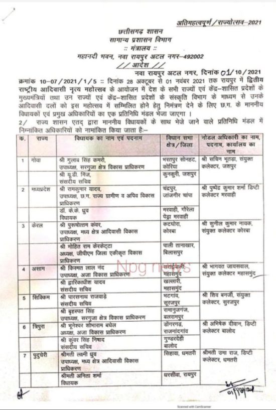 रायपुर, 3 अक्टूबर 2021। छत्तीसगढ़ में दूसरे आदिवासी महोत्सव के लिए राज्य सरकार ने तैयारी शुरू कर दी है। 28 अक्टूबर से 01 नवंबर तक राज्योत्सव का आयोजन किया जाएगा। सामान्य प्रशासन विभाग ने दूसरे राज्यों व केंद्र शासित प्रदेशों में जाकर आदिवासी दलों को निमंत्रण देने वाली टीम का ऐलान किया है। इस बार मंत्री और सचिव स्तर के अधिकारी नहीं बल्कि संसदीय सचिव, विधायक और डिप्टी कलेक्टर रैंक के अफसर जाएंगे। इसके अलावा प्राधिकरण के उपाध्यक्ष को भी जिम्मेदारी दी गई है।