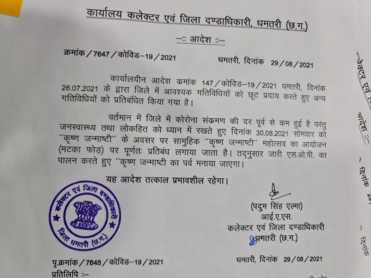 धमतरी 29 अगस्त 2021। कलेक्टर पदुम सिंह एल्मा कोरोना को लेकर श्रीकृष्ण जन्माष्टमी को लेकर दिशा-निर्देश जारी किए हैं। आदेश में कहा गया है कि जनमाष्टमी के मौके पर किसी भी तरह का सामूहिक आयोजन और मटका फोड़ का आयोजन नहीं होगा। आज शाम कलेक्टर ने जनमाष्टमी को लेकर स्पष्ट निर्देश जारी किये हैं। कलेक्टर ने एल्मा ने कहा है कि कोरोना का खतरा फिलहाल खत्म नहीं हुई है, लिहाजा जनमाष्टमी के मौके पर एहितियात बरतनी बेहद जरूरी है। आपको बता दें कि जनमाष्टमी का आयोजन जिले में काफी धूमधाम से होता है। कई जगह पर मटका फोड़ प्रतियोगिता आयोजित की जाती थी। कई आयोजकों ने मरीजों की कम संख्या को देखते हुए इसकी तैयारी भी कर ली थी, लेकिन अब खबरें आ रही है कि किसी भी तरह के सामूहिक आयोजन पर प्रतिबंध लगा दिया गयाहै।