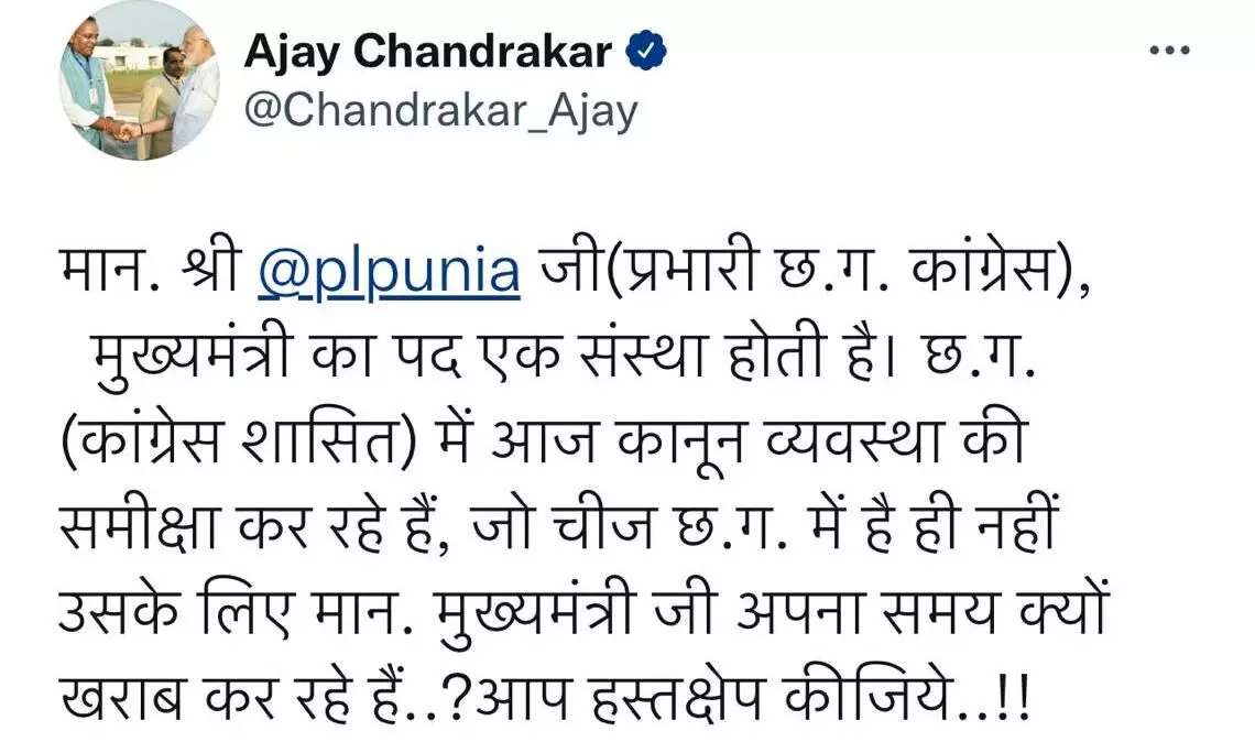 अजय चंद्राकर ने ट्वीट में प्रदेश कांग्रेस संगठन प्रभारी पी एल पुनिया और मुख्यमंत्री भूपेश बघेल को टैग करते हुए लिखा है -