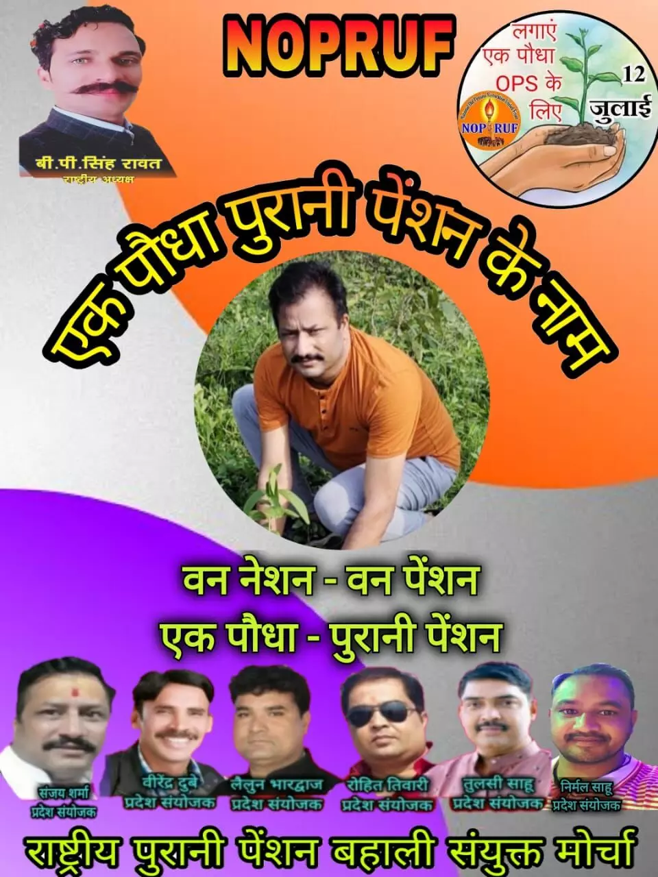 12/07/20 को पेड़ लगाएं, पुरानी पेंशन पाएं कार्यक्रम के तहत छत्तीसगढ़ में हजारो पौधे लगाये जायेंगे, पौधे के साथ सेल्फी/फ़ोटो लेकर सभी सोशल/प्रिंट/इलेक्टानिक मीडिया में प्रचार करके प्रधानमंत्री व मुख्यमंत्री से पुरानी पेंशन की मांग करेंगे।