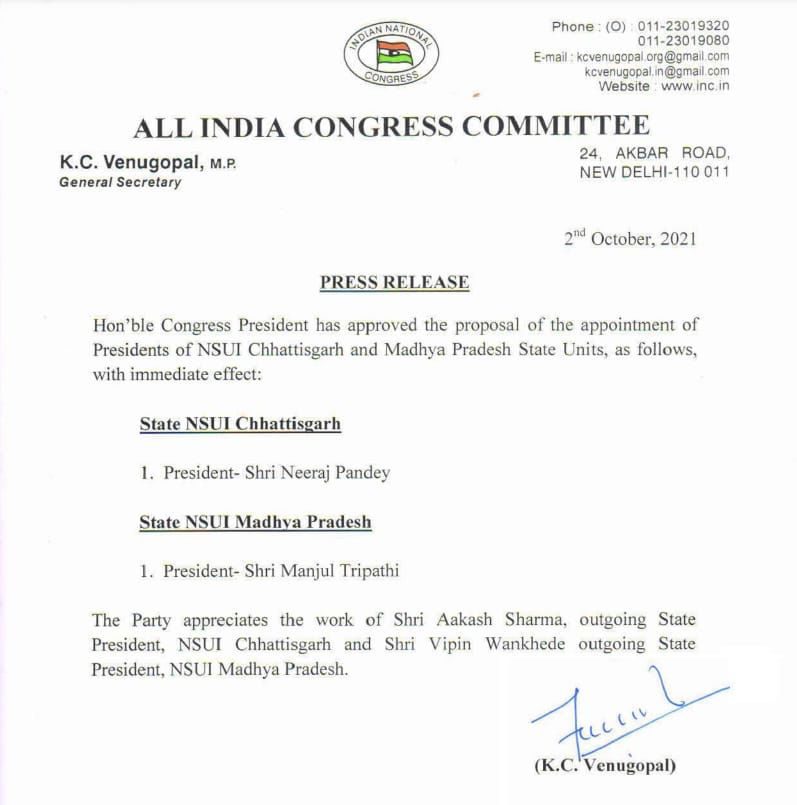 नई दिल्ली,2 अक्टूबर 2021। कांग्रेस के राष्ट्रीय महासचिव के सी वेणुगोपाल ने अब से कुछ देर पहले आदेश जारी कर मध्यप्रदेश और छत्तीसगढ़ के NSUI अध्यक्षों को बदल दिया है।