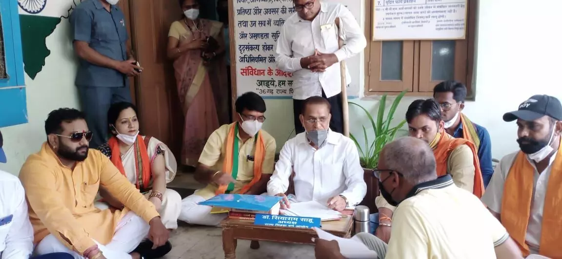 जमीन पर दफ्तर: पिछडा वर्ग अध्यक्ष सियाराम ने आफिस के प्रांगण में ज़मीन पर बैठ शुरु किया काम..बोले “मेरा दायित्व है.. निभा रहा हूँ.. कक्ष बंद है.. सत्याग्रह जारी रहेगा”
