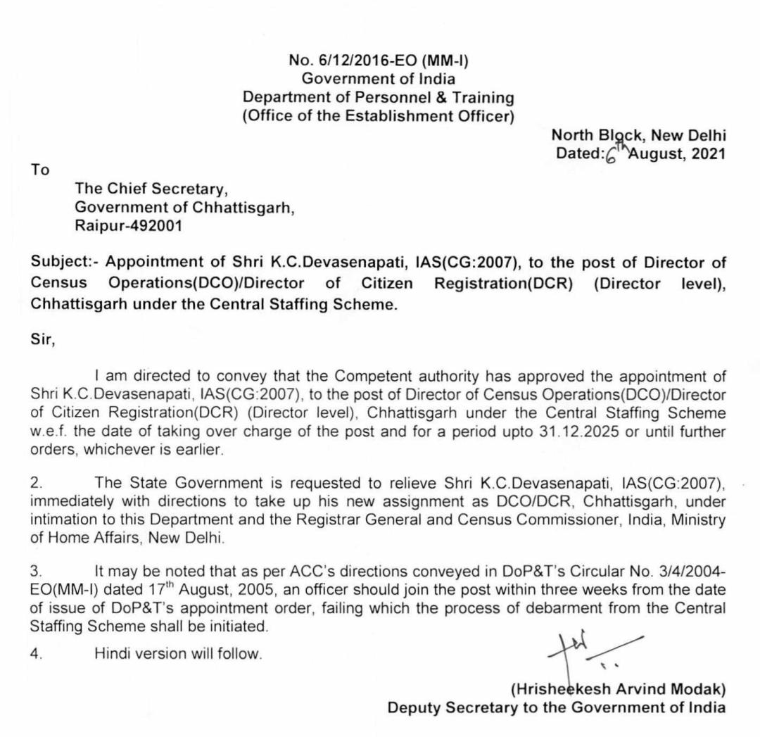 रायपुर 19 सितंबर 2021। आईएएस केसी देवसेनापति छत्तीसगढ़ में डायरेक्टर सेनसस (जनसंख्या) आपरेशन होंगे। केंद्र सरकार ने पोस्टिंग आदेश जारी करते हुए छत्तीसगढ़ सरकार को केसी देवसेनापति को तुरंत बाकी जिम्मेदारियों से मुक्त करने को कहा है।