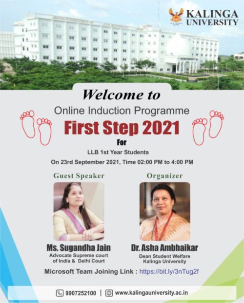 ‘‘फस्र्ट स्टेप – 2021‘‘ के आॅनलाईन आयोजन के प्रथम चरण में कलिंगा विश्वविद्यालय के कुलपति डाँ. आर श्रीधर, महानिर्देशक डाँ. बैजू जाॅन, कुलसचिव डाँ. संदीप गांधी, छात्र कल्याण अधिष्ठाता डाँ. आशा अंभईकर, अकादमिक कार्यो के अधिष्ठाता राहुल मिश्रा, विधि विभाग की प्रभारी विभागाध्यक्ष शोभा सिंह ठाकुर और मुख्य अतिथि सुप्रीम कोर्ट एवं दिल्ली हाई कोर्ट की प्रख्यात अधिवक्ता सुगंधा जैन की उपस्थिति में कपिल केलकर एवं श्रेया द्विवेदी के कुशल संचालन में ज्ञान और विद्या की देवी माँ सरस्वती वंदना करने के पश्चात कार्यक्रम का शुभारंभ हुआ।