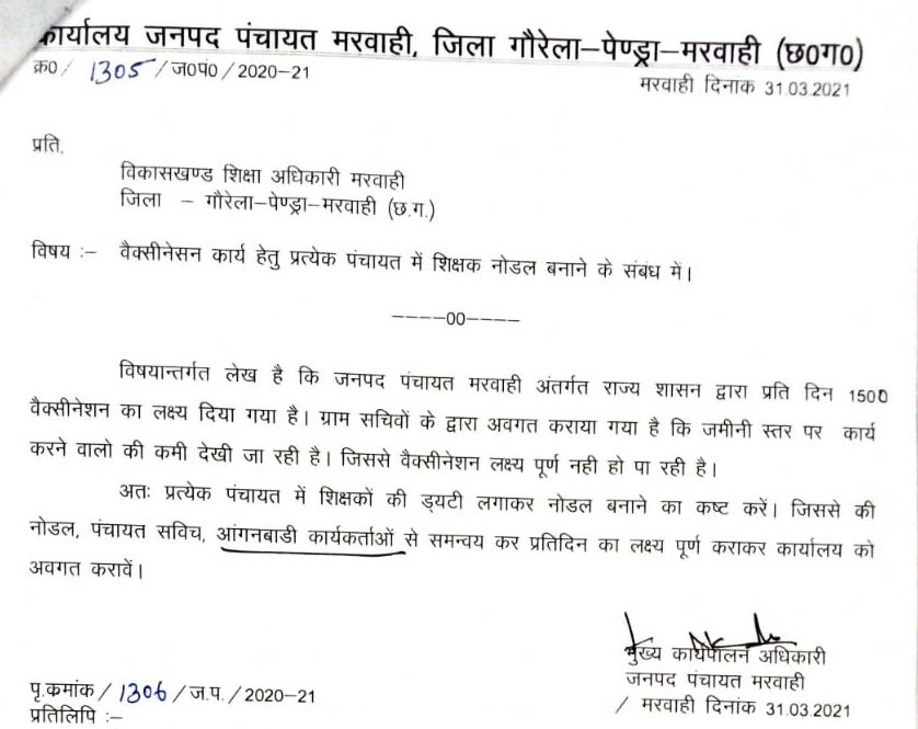 “राज्य शासन ने मरवाही में प्रतिदिन 1500 वैक्सीनेशन का लक्ष्य दिया है। ग्राम सचिवों के द्वारा अवगत कराया गया है कि जमीनी पर स्तर पर कार्य करने की कमी देखी जा रही है, जिससे वैक्सीनेशन लक्ष्ण पूर्ण नहीं पा रहा है। अत: प्रत्येक पंचायत में शिक्षकों की ड्यूटी लगाकर नोडल बनाने का कष्ट करें जिससे की नोडल, पंचायत सचिव, आंगनबाड़ी कार्यकर्ताओं से समन्वय कर प्रतिदिन का लक्ष्ण पूर्ण कराकर कार्यालय को अवगत करायें”