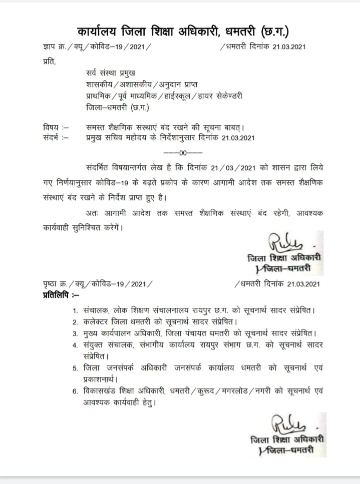 वहीं उच्च शिक्षा विभाग ने भी कॉलेजों को बंद करने का आदेश दिया है। आदेश में कहा गया है कि कक्षाएं ऑनलाइन तरीके संचालित होगी।