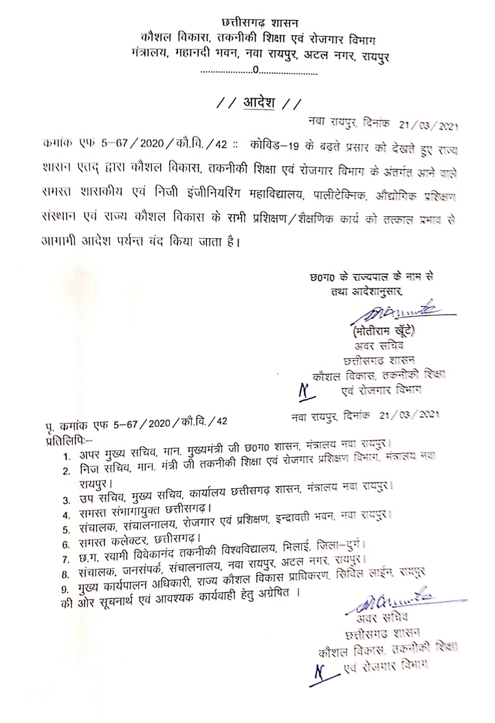 स्कूलों के अलावे सभी शासकीय और प्राइवेट इंजीनियरिंग कालेज, पॉलिटेक्निक कालेज, आईआईटी और कौशल विकास के सभी केंद्रों को तत्काल प्रभाव से बंद करने का आदेश तकनीकी शिक्षा और कौशल विकास विभाग की तरफ से जारी कर दिया गया है।