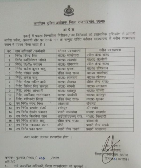 राजनांदगांव 2 अगस्त 2021. एसपी डी श्रवन ने जिले में पदस्थ निरीक्षक और उप निरीक्षकों की ट्रांसफर लिस्ट जारी की है… जारी सूची में जिन अधिकारियों के नाम है वो इस प्रकार है…