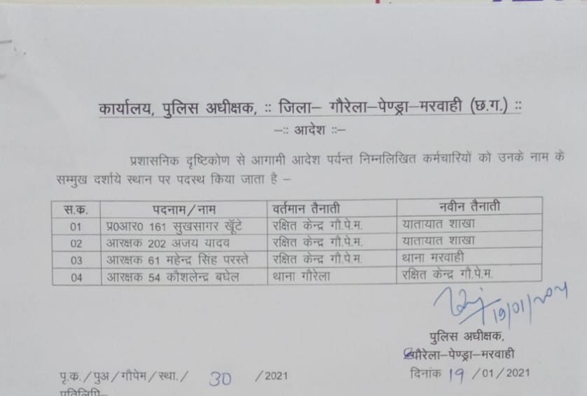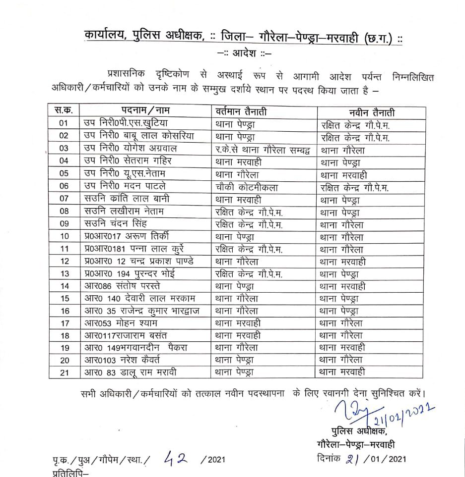 जीपीएम 21 जनवरी 2021. जिले में पदस्थ उप निरीक्षक, सहायक उप निरीक्षक सहित कई पुलिसकर्मियों के तबादले ऑर्डर जारी किये गए है. जारी लिस्ट में छह एसआई, तीन एसआई, पांच प्रधान आरक्षक और 11 आरक्षकों के नाम शामिल है… देखें लिस्ट