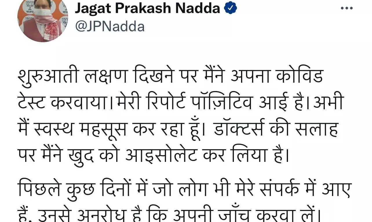 भाजपा के राष्ट्रीय अध्यक्ष जे पी नड्डा ने ट्वीट कर खुद के संक्रमित होने की जानकारी दी है। उन्होंने आग्रह किया है कि जो भी उनके संपर्क में आए हों वे टेस्ट कराए और आईसोलेट रहें।