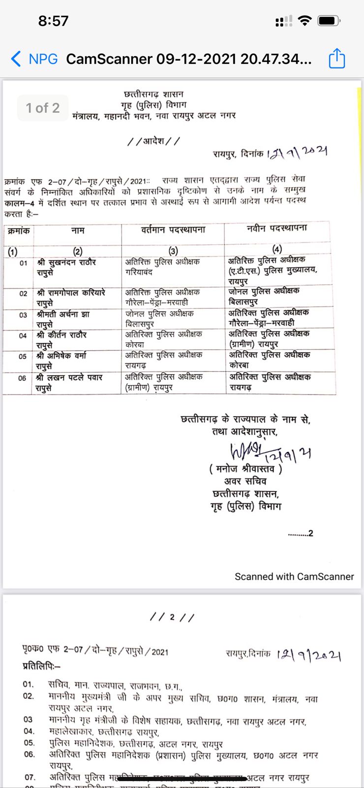 एडिशनल एसपी सुखनंदन राठौड़ को ATS रायपुर, कीर्तन राठौड़ को रायपुर, लखन पाटले को रायगढ़, अभिषेक वर्मा को कोरबा, रामगोपास करियारे को ज़ोनल एसपी बिलासपुर बनाया गया है.