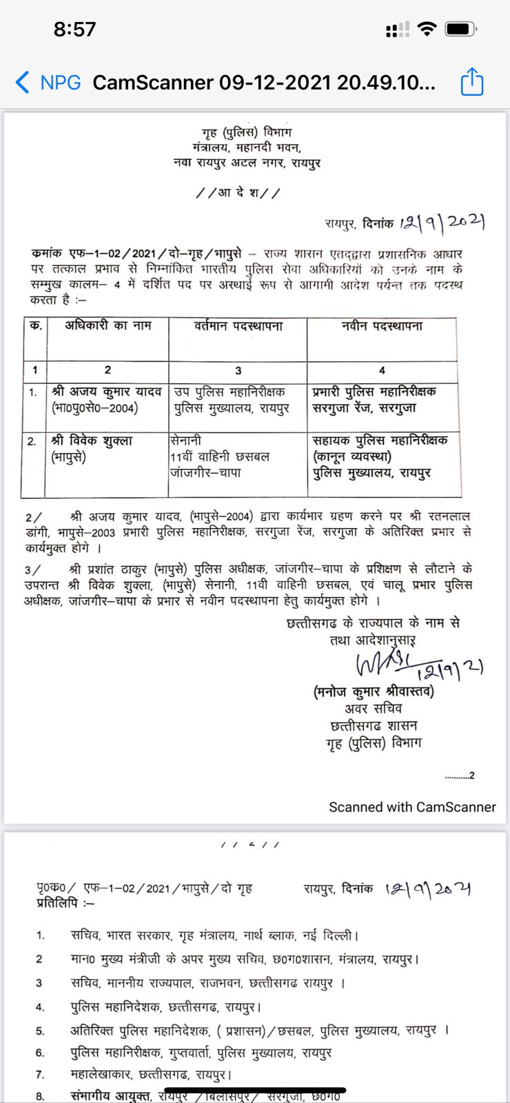 रायपुर,12 सितंबर 2021। तेज तर्रार आईपीएस अजय यादव को अब सरगुजा रेंज आईजी की जवाबदेही दी गई है। विवेक शुक्ला को पीएचक्यू में DIG क़ानून व्यवस्था का प्रभार मिला है। वहीं एक अन्य आदेश में पाँच एडिशनल एसपी के पदस्थापना स्थल में परिवर्तन हुआ है।