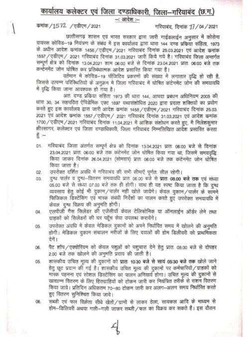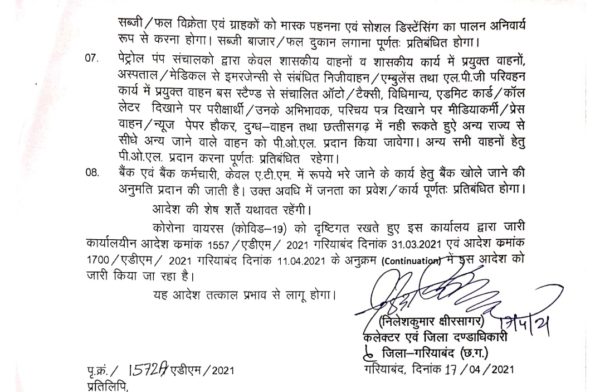 गरियाबंद/ रायगढ़ 17 अप्रैल 2021. में लॉकडाउन की अवधि बढ़ने के बाद अब गरियाबंद और रायगढ़ जिले में भी लाॅकडाउन बढ़ा दिया गया है। इस संबंध में कलेक्टर निलेश कुमार क्षीरसागर और कलेक्टर भीम सिंह आदेश जारी किया है। देखें आदेश….