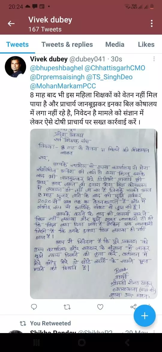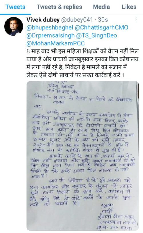 मुझे बीते 7 माह से वेतन नहीं मिला है जिसमें मेरी कोई भी गलती नहीं है कार्यालय की लापरवाही का खामियाजा मैं भुगत रही हूं बिना वेतन के मैं कैसे जीवन बसर कर रही हूं आप खुद समझ सकते हैं । मेरे मामले में लगातार दुबे सर ने प्रयास करके राज्य कार्यालय से भी संशोधित आदेश जारी करवा दिया उसके बाद भी प्राचार्य बिल जमा नहीं कर रहे हैं और मुझे जानबूझकर परेशान कर रहे हैं ।
