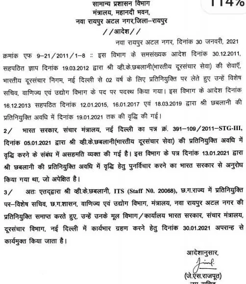 रायपुर, 30 जनवरी 2021। वाणिज्य और उद्योग विभाग के स्पेशल सिकरेट्री व्ही के छबलानी को छत्तीसगढ़ सरकार ने आज कार्यमुक्त कर दिया। दूरसंचार सेवा के अधिकारी छबलानी मार्च 2012 में प्रतिनियुक्ति पर छत्तीसगढ़ आए थे।