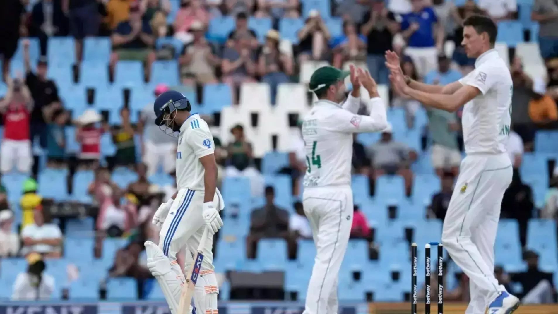 दक्षिण अफ्रीका को लंच के बाद 408 रन पर आउट करने के बाद भारत की शुरुआत अच्छी नहीं रही। ओपनिंग करने आये कप्तान रोहित शर्मा तीसरे ही ओवर में शून्य पर रबाडा की गेंद पर बोल्ड हो गये। छठे ओवर में नांद्रे बर्गर की उठती और अच्छी तरह से निर्देशित शॉर्ट गेंद पर जायसवाल कैच दे बैठे।