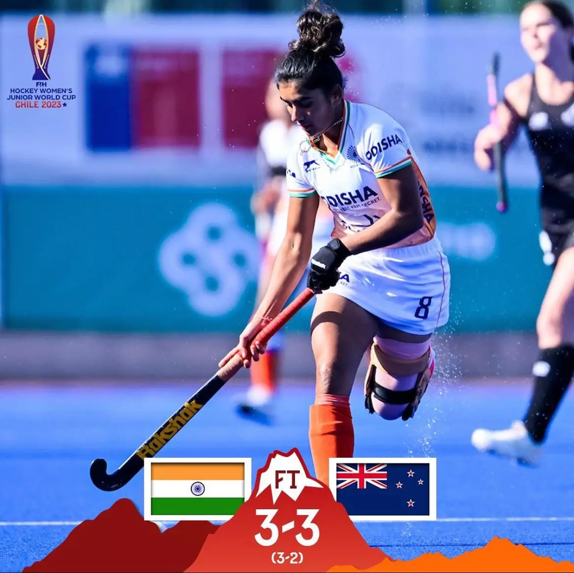 Junior Women's Hockey World Cup: भारतीय जूनियर महिला हॉकी टीम ने एफआईएच हॉकी महिला जूनियर विश्व कप 2023 के अपने चौथे मैच में शानदार प्रदर्शन किया और निर्धारित समय तथा पेनल्टी शूटआउट बराबर रहने के बाद सडन डेथ में न्यूजीलैंड को 3-2 से हरा दिया।
