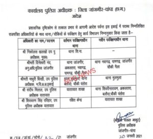 नए फेरबदल के तहत डीएसपी सन्दीप मित्तल जो यातायात डीएसपी का प्रभार सम्हाल रहे थे,वो अब थाना शिवरीनारायण, अकलतरा,बलौदा के साथ ही चैकी पंतोरा की जिम्मेदारी सम्हालेंगे। उनके स्थान पर लाइन में पदस्थ शिवचरण सिंग परिहार यातायात का चार्ज सम्हालेंगे। एसडीओपी दिनेश्वरी नन्द के अंडर में अब थाना नवागढ़,पामगढ़,जांजगीर, चैकी नैला का प्रभार होगा,तो वही डीएसपी माधुरी धिरही के सुपरविजन में अब मुलमुला थाना होगा। डीएसपी निकोलस खलको से शिवरीनारायण का चार्ज वापस ले लिया गया हैं अब वो सिर्फ डीएसपी हेडक्वार्टर के चार्ज में रहेंगे।