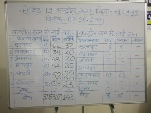 सूरजपुर ज़िला प्रशासन ने सरपंच सचिवों और कोटवारों के ज़रिए ग्रामीणों तक चार नंबर भिजवाए और उन्हें बतौर कंट्रोल रुम स्थापित कर दिया। जिसमें बाक़ायदा स्टाफ़ लगाया गया है। इसकी सतत मॉनीटरिंग खुद कलेक्टर ग़ौरव सिंह कर रहे हैं।