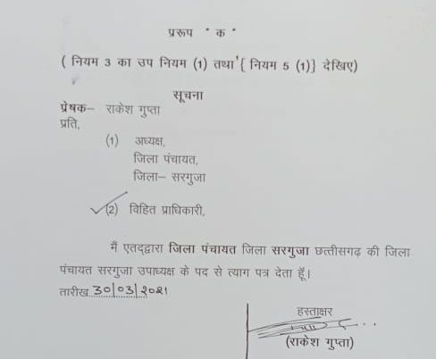 सरगुजा ज़िला पंचायत उपाध्यक्ष राकेश गुप्ता ने दिया इस्तीफ़ा.. अब आदित्येश्वर सिंहदेव बनेंगे ज़िला पंचायत उपाध्यक्ष