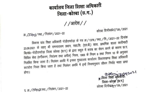 दरअसल 24 सितंबर को शिक्षक का एक वीडियों जमकर वायरल हुआ था। शराबी शिक्षक का वीडियों सामने आने के बाद कोरबा जिला शिक्षा अधिकारी ने तत्काल प्रभाव से शिक्षक को निलंबित कर दिया है। निलंबन के दौरान शिक्षक रामनारायण प्रधान मुख्यालय कार्यालय विकासखण्ड कटघोरा में पदस्थ रहेंगे।