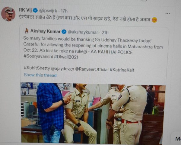 ”कई परिवारों की ओर से शुक्रिया आज मुख्यमंत्री उद्धव ठाकरे को दिया जा रहा है,यह बेहद शानदार है कि महाराष्ट्र में 22 अक्टूबर से सिनेमाघरों को खोले जाने की उन्होंने अनुमति दे दी है.. अब किसी के रोके ना रुकेगी – आ रही है पुलिस..”