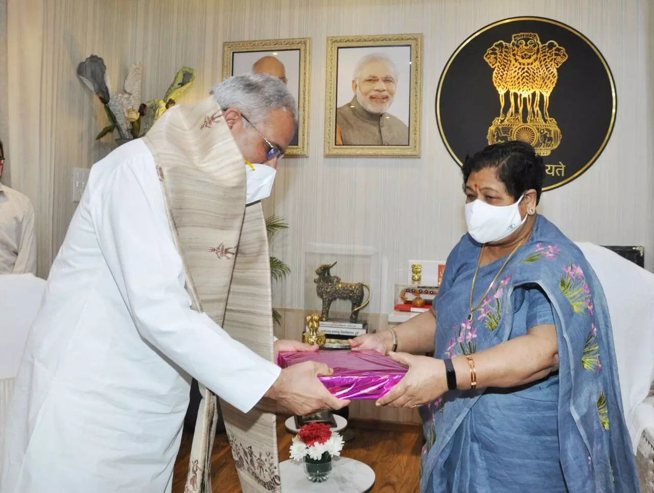 रायपुर 13 जुलाई 2021। राजभवन से लगातार चल रही मतभेदों की खबरों के बीच आज मुख्यमंत्री भूपेश बघेल राज्यपाल अनुसूईया उईके से मिलने पहुंचे। मौजूदा राज्यपाल के कार्यकाल में ये पहला मौका था, जब इस तरह से मुख्यमंत्री अनौपचारिक रूप से बातचीत के लिए पहुंचे थे। शाम साढ़े 5 बजे हुई इस मुलाकात के दौरान राज्यपाल ने मुख्यमंत्री को शाल एवं प्रतीक चिन्ह देकर सम्मान दिया तो मुख्यमंत्री ने भी राज्यपाल को साड़ी भेंट की। खास बात यह रही कि राज्यपाल ने कोरोना से बचाव कार्यों के लिए मुख्यमंत्री के उल्लेखनीय प्रयासों की सराहना की।