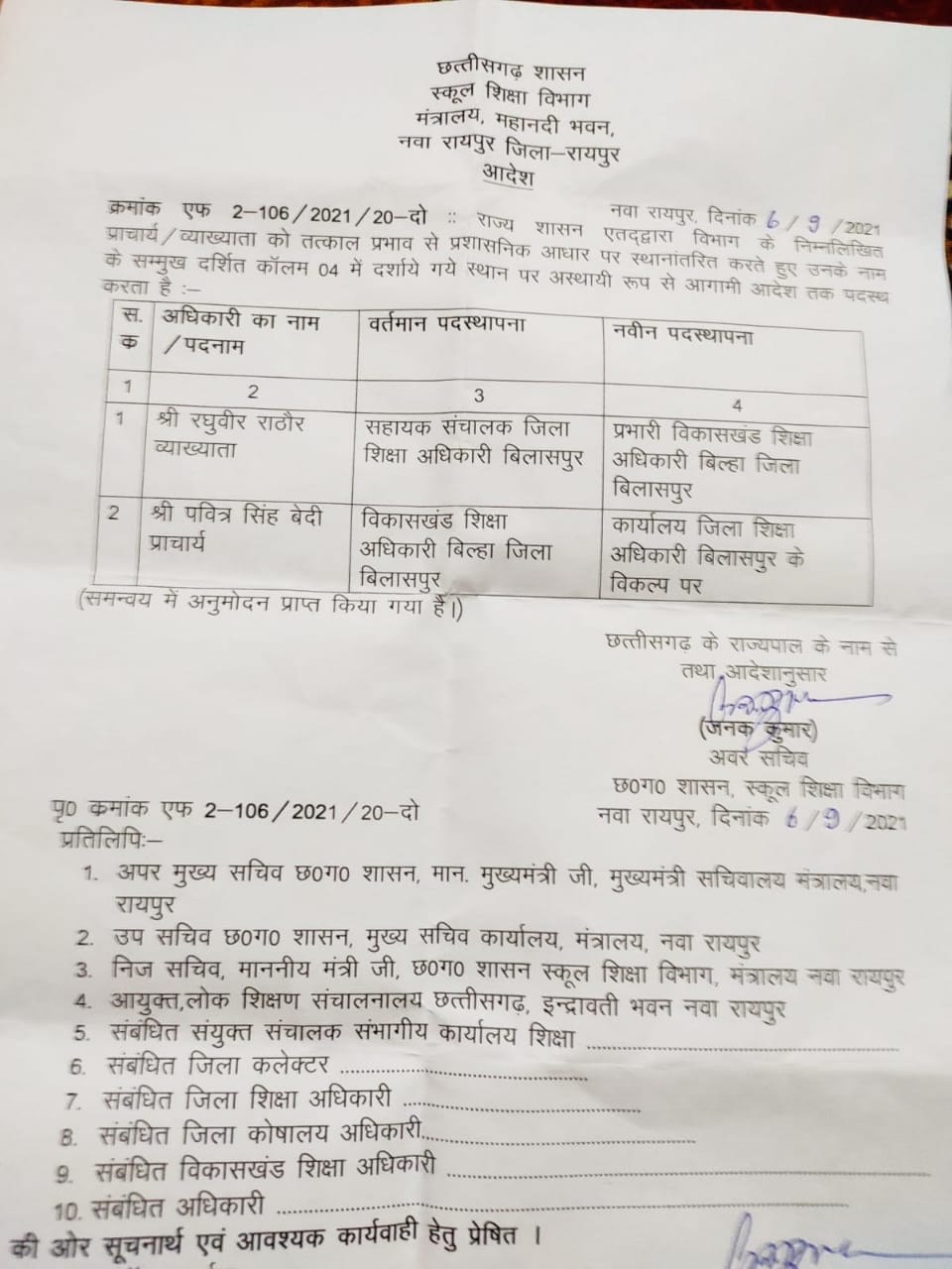 वहीं व्याख्याता रघुबीर राठौर को बिल्हा का प्रभारी बीईओ बनाया है। वो अभी डीईओ कार्यालय में सहायक संचालक के तौर पर पदस्थ थे। नये बीईओ रघुवीर राठौर पर डीईओ एसके प्रसाद ने रिलीव कर दिया है।