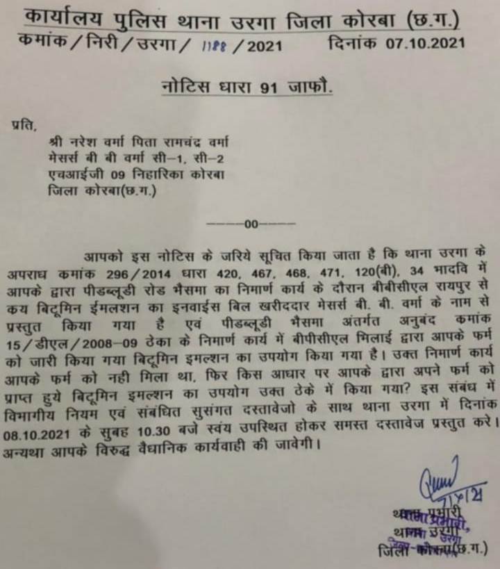 नोटिस में भैसमा सड़क निर्माण का हवाला देते हुए लिखा है कि पीडब्लूडी रोड निर्माण कार्य के दौरान बीबीसीएल रायपुर से क्रय बिटुमिन इमलशन का इनवॉइस बिल ख़रीरदार मेसर्स बीबी वर्मा के नाम पर प्रस्तुत किया गया हैं एवं पीडब्ल्यूडी भैसमा अंतर्गत अनुबंध क्रमांक 15 /डीएल/2008-09 ठेका के निर्माण कार्य में बीपीसीएल भिलाई द्वारा आपके फर्म को जारी किया गया बिटुमिन इमलशन का उपयोग किया गया है। यह निर्माण कार्य बीबी वर्मा के फर्म को नही मिला था। इसके बाद भी बिटुमिन इमलशन का उपयोग किया गया है। इस संबंध में विभागीय नियम एवं संबंधित दस्तावेजो के साथ कल थाना आएं।