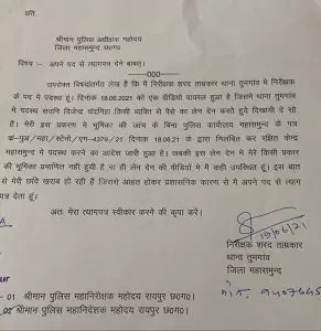 “ मेरी इस प्रकरण में भूमिका की जांच के बिना पुलिस कार्यालय महासमुंद के द्वारा निलंबित कर रक्षित कंद्र महासमुंद में पदस्थ करने का आदेश जारी हुआ है, जबकि इस लेन देन में में मेरे की प्रकार की भूमिका प्रमाणित नहीं हुई है और ना ही लेन देन की वीडियो में मैं कहीं उपस्थित हूं। इस बात से मेरी छवि खराब हो रही है, जिससे आहत होकर प्रशासनिक कारणों से मैं अपने पद से त्यागपत्र देता हूं।