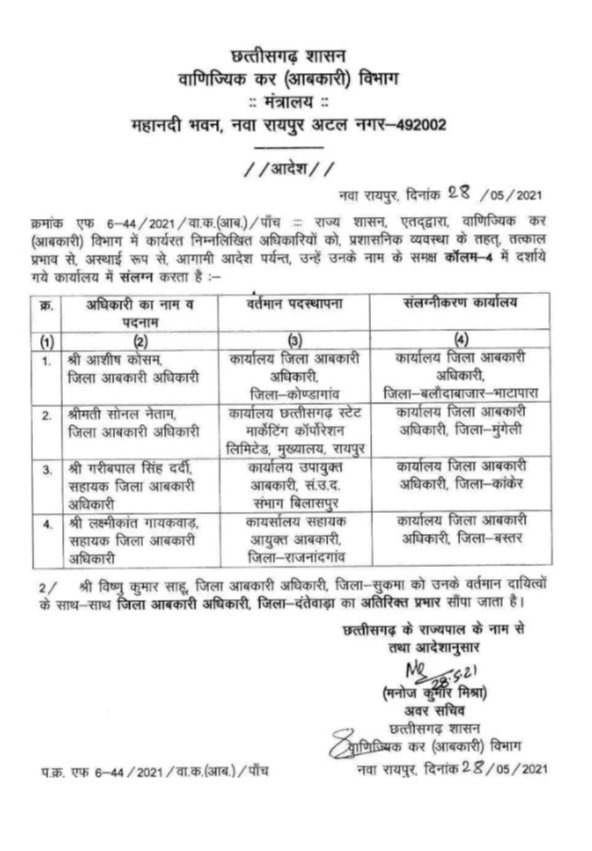वहीं सुकमा के जिला आबकारी अधिकारी विष्णु कुमार साहू को दंतेवाड़ा के आबकारी अधिकारी का एडिश्नल चार्ज दिया गया है।