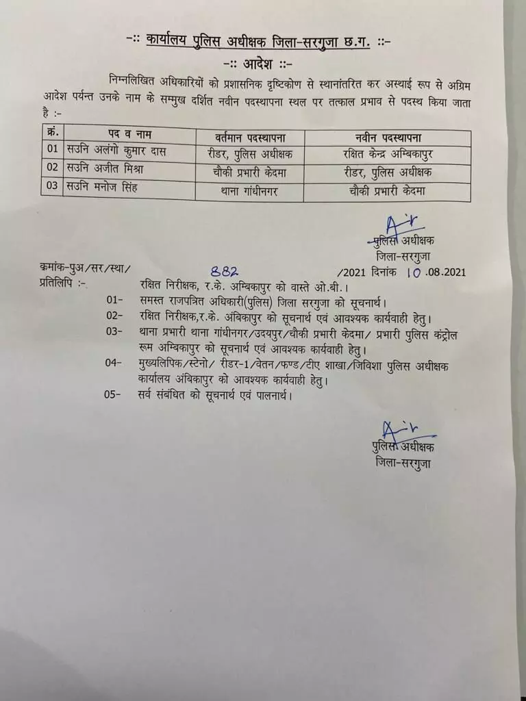 अंबिकापुर,10 अगस्त 2021। सरगुजा पुलिस में तबादले किए गए हैं। कप्तान अतुल तुकाराम कांबले ने केदमा चौकी प्रभारी अजीत मिश्रा को रीडर बनाया है जबकि गांधीनगर में पदस्थ ASI मनोज सिंह को केदमा का चौकी प्रभारी बनाया गया है। वहीं रीडर रहे अनुभवी और व्यवहार कुशल अलंगो दास को लाईन भेजा गया है।
