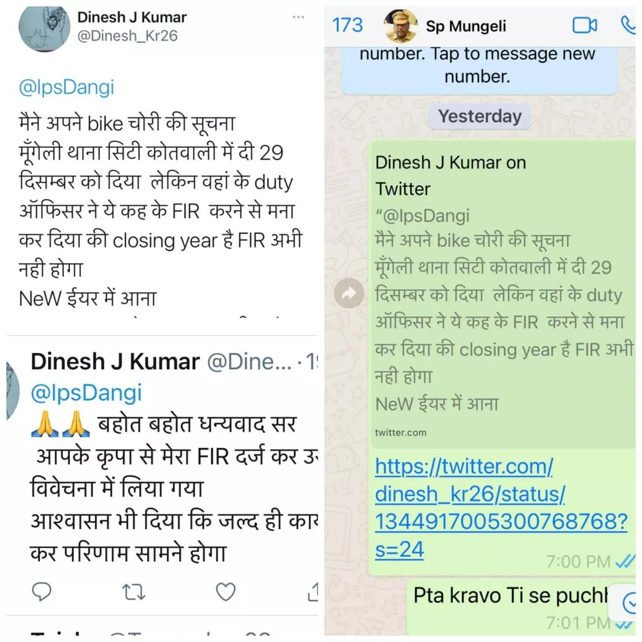 दिनेश कुमार नाम के यूज़र ने आईजी डांगी को एक जनवरी को ट्विटर पर लिखा –