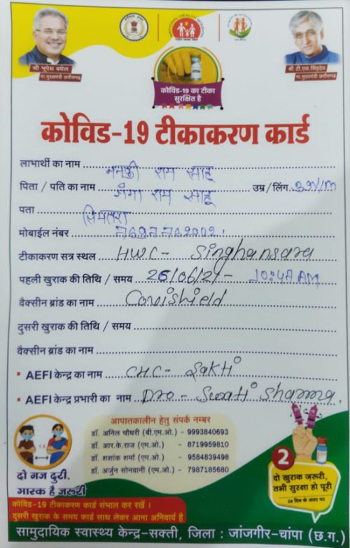 वहीं जांजगीर के सीएमएचओ डाॅ एसआर बंजारे ने पत्रकारों को बताया, सक्ती बीएमओ ने अपने स्तर पर कार्ड छपवाया था। विकासखण्ड में बंटे त्रुटिपूर्ण कोविड टीकाकरण कार्ड के सम्बंध में बीएमओ से जानकारी ली गई है।