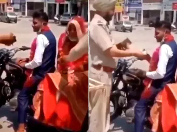 #COVID प्रोटोकॉल का पालन कर नव विवाहित बाइक से घर जा रहे थे. पुलिस ने घर के बड़े की तरह बधाई व नेग दिया.
