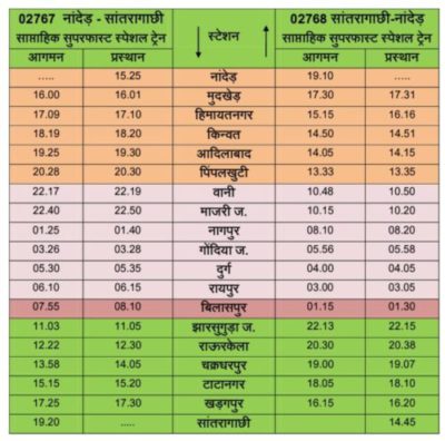 इसी प्रकार गाड़ी संख्या 02768 सांतरागाछी-नांदेड़ साप्ताहिक स्पेशल प्रत्येक बुधवार को सांतरागाछी से 14.45 बजे रवाना होगी तथा दक्षिण पूर्व मध्य रेलवे के ठहराव वाले बिलासपुर स्टेशन में दूसरे दिन आगमन 01.15 बजे प्रस्थान 01.30 बजे, रायपुर स्टेशन में आगमन 03.00 बजे प्रस्थान 03.05 बजे, दुर्ग स्टेशन में आगमन 04.00 बजे प्रस्थान 04.05 बजे, गोंदिया स्टेशन में आगमन 05.56 बजे प्रस्थान 05.58 बजे होते हुये 19.10 बजे नांदेड़ पहुंचेगी|