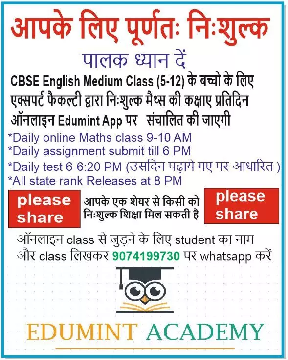 घर बैठे “मैथ्स” की कर सकते हैं आप फ्री क्लास……Edumint Academy ने शुरू की ऑनलाइन क्लास की अनूठी व्यवस्था….इस नंबर पर WhatsApp कर क्लास के बाद टेस्ट, असाइनमेंट व डाउट्स भी क्लियर कर सकेंगे बच्चे ….